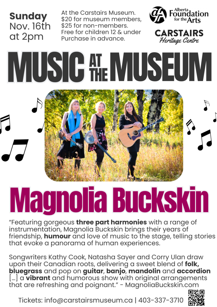 We welcome musical trio Magnolia Buckskin to the Carstairs Museum. Please learn more on our Programs & Events page.